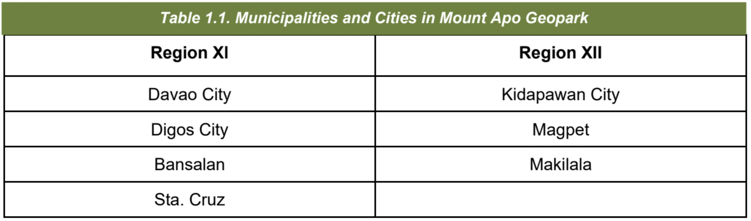 Mount Apo Geopark, also recognized as ASEAN Heritage Park in 1984, through the ASEAN Declaration on Heritage Parks and Reserves, covers Region XI and Region XII, which comprises three (3) cities and four (4) municipalities.